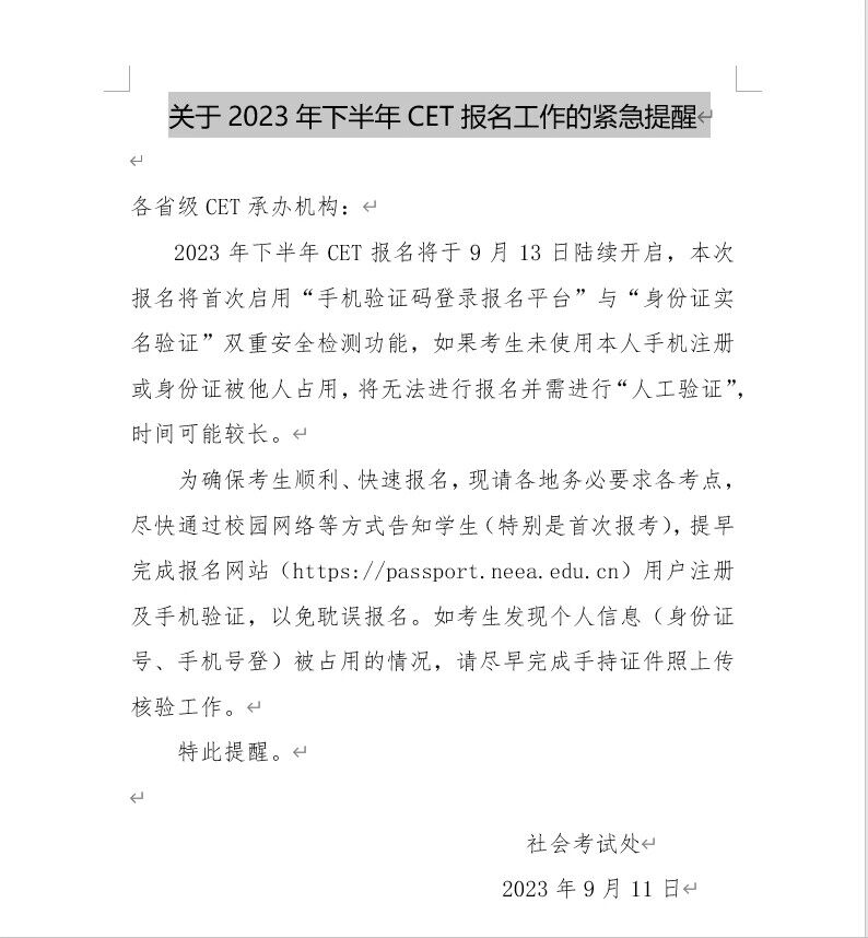 关于2023年下半年全国大学英语四六级考试报名工作的紧急提醒
